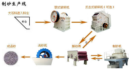 制砂生產(chǎn)線由振動(dòng)給料機(jī)、破碎機(jī)、制砂機(jī)(細(xì)碎機(jī))、洗砂機(jī)、振動(dòng)篩和膠帶傳輸機(jī)等設(shè)備組合而成。用戶可根據(jù)不同的工藝要求,來自行進(jìn)行組合,以滿足不同的工藝要求。