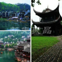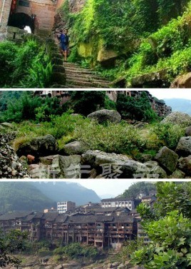 古鎮(zhèn)迎客瀑從百年榕樹腳下瀉出,好似白龍投水,躍飛河上。驚險(xiǎn)古湍的大丙灘下丙灘渡懸流數(shù)十丈。灘下水深14米,河水湍湍,立于船頭,會(huì)感急流震吼,青山飛馳,而頭暈?zāi)垦?,膽顫心驚,卻又有驚無險(xiǎn),剌激快悅。古鎮(zhèn)沿河峭壁懸?guī)r河畔的房舍建筑都是吊腳風(fēng)格,懸空樓、虛腳樓、無底樓、獨(dú)柱高腳樓,參差不齊,錯(cuò)錯(cuò)落落,別有風(fēng)韻。特別一提的是罕有的古風(fēng)“葫蘆”石板街,先讓游人領(lǐng)略狹窄壓抑的“一線天”街景,轉(zhuǎn)過急彎便看不街道,仿佛進(jìn)入了死胡同。但只要走近再拐個(gè)彎,一條寬敞石板街就會(huì)瞬間出現(xiàn),讓人豁然開朗。
