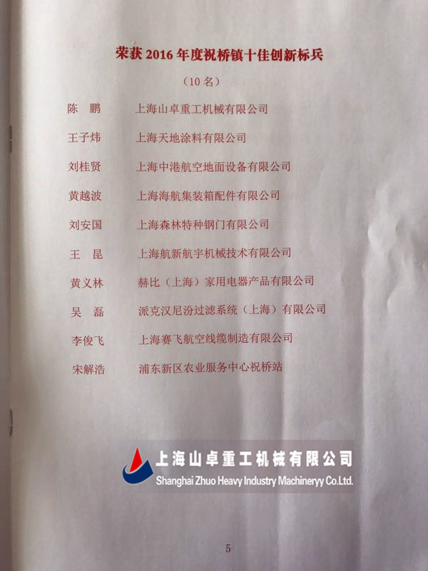 熱烈祝賀上海山卓重工陳鵬獲得2016年度浦東新區(qū)祝橋鎮(zhèn)“十佳創(chuàng)新標(biāo)兵”上海山卓重工機(jī)械有限公司是一家以科技領(lǐng)先、追求卓越、專業(yè)從事大中型系列礦山機(jī)械的生產(chǎn)廠家,主要生產(chǎn)烘干設(shè)備、破碎設(shè)備、磨機(jī)設(shè)備、制砂設(shè)備、選礦設(shè)備、磨粉機(jī)設(shè)備、砂石生產(chǎn)線等重型機(jī)械設(shè)備為主。